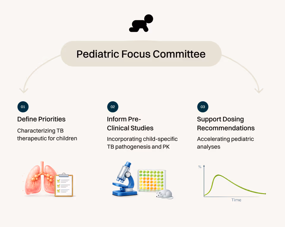 Children are typically not considered until adult drug development is complete, leading to pediatric dosing recommendations that rely on limited data and often overlook principles of developmental pharmacology. Our work seeks to strengthen both early- and late-phase pediatric TB drug development by: (a) predicting pediatric dosing for new molecules early in the development pathway; (b) revising recommendations for existing drugs that yield unacceptably poor treatment outcomes in certain subgroups of children; (c) identifying high-burden populations in need of treatment optimization, including children who are HIV-positive, malnourished, or very young; (d) using real-world data to predict pharmacokinetics in representative pediatric populations; and (e) applying model-based approaches and prior trial data to design smarter, more efficient pediatric trials. Ensuring that children with TB benefit from advances in TB therapeutics as early as possible is critically important. The Pediatric Focus Committee (PFC) brings together experts in developmental immunology, pediatric TB biomarkers, developmental pharmacology and PK modeling, first-time-in-pediatric and PK-safety studies, and pediatric formulations to achieve these goals.
