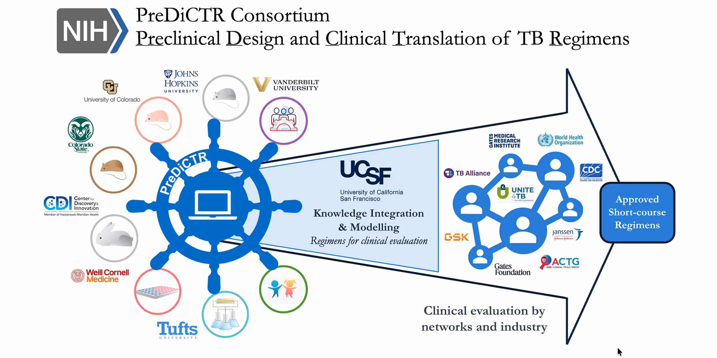 The PReDiCTR-TB Consortium integrates advanced technologies developed by the core group’s preclinical labs, including: highly predictive TB mouse models and an ultra-short-course murine model to assess treatment-shortening in one month (JHU/CSU Mouse PL); LCM-based drug distribution analysis and ex vivo caseum potency models (HMH CDI DMPK PL); physiologic, culture-independent potency biomarkers such as the RS ratio (CU PhyBM PL); large-scale empirical assays of combination drug responses in Mtb (TU DiaMOND PL); metabolomic and chemogenomic platforms to study drug action and resistance (WCM/RU Omics PL); and advanced data science and modeling tools (UCSF DSMG).